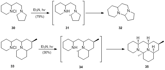 - M. Kimura and Y. Ban demonstrated that adjacent nitrogen atoms can stabilize radical species generated by H-atom abstraction and permit this step to take place under weakly basic conditions[20][21] They reported that far better yields are obtained on photoirradiation in the presence of triethylamine, which neutralizes the hydrogen chloride generated by cyclization. M. Kimura and Y. Ban employed the modified conditions of the Hofmann–Löffler–Freytag reaction to the synthesis of dihydrodeoxyepiallocernuine 35.[20]