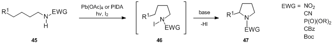 The great advantage of the Suárez modification is that the reaction can be performed under very mild neutral conditions compatible with the stability of the protective groups most frequently used in synthetic organic chemistry. Consequently, it permits the use of the Hofmann–Löffler–Freytag reaction with more sensitive molecules. Other notable features of this methodology are the following: (1) the unstable iodoamide intermediates are generated in situ; (2) the iodoamide homolysis proceeds thermally at low temperature (20–40 °C) or by irradiation with visible light, which obviates the need for a UV lamp. The Suárez modification has found numerous applications in synthesis (vide infra).
