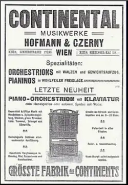 Towards the end of the 19th and the beginning of the 20th century, many Austria-Hungary companies tried to compete in the enormous success of the German piano orchestrions with their own products. In 1913 Hofmann developed an orchestrion after taking steps towards the cinema organ. The Hofmann & Czerny piano company with the “Continental” brand, in contrast to other smaller brands at the time such as the Stingl brothers used to be a leader in the orchestrion instrument in the Austria-Hungary empire.