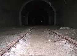 Where possible, the tunnel routes avoided granite and instead they were routed through looser shale rock formations; this speeded up construction and was less labour-intensive, but it could also be dangerous due to an increased risk of rockfalls. The tunnels were dug by the traditional method of drilling and blasting. When the tunnels were bored out, they were lined with concrete. First, the floor was lined, followed by the walls, and, finally, the roof. The walls were concreted using wooden shuttering, the space between the shuttering and the rock face was filled with concrete, and the shuttering subsequently removed. The roof was made in the same way, but using curved shuttering balancing on the concrete walls. Concrete was poured down the escape shafts rather than through the tunnel entrances to avoid contamination with the rock leaving the tunnel; these chutes can still be seen in many of the tunnels.[2]