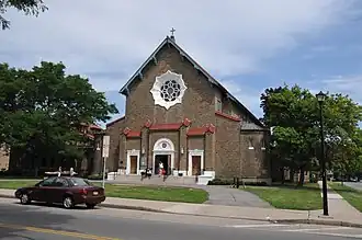 Holy Rosary Church Complex is a historic Roman Catholic church complex located in the Edgerton neighborhood of Rochester, Monroe County, New York. The complex consists of the church (1916), rectory (c. 1916), convent (1911), and two-story garage. All buildings in the complex are in a Spanish eclectic, Arts and Crafts style. The buildings are constructed of hollow tile brick and three feature their original Spanish clay tile roofs. The church features a rose window in the Mudéjar style similar to that of the Mission San Carlos Borromeo de Carmelo. The church also features a square brick bell tower in the southwest corner.[2]