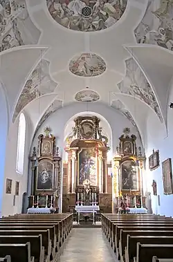The majority of the church's furnishings date from the time the church was built. The altar panels of all of the four altars were created by the electoral court painter Johann Caspar Sing from Munich. The main altar painting depicts the Holy Kinship, Jesus Christ surrounded by his relatives. Up to the beginning of the 19th century, the interior of the church was also decorated by ceiling paintings by the famous artist, Cosmas Damian Asam. Today's ceiling frescoes are Michael P. Weingartner's work from 1952. They show various scenes of the life of Francis of Assisi. The church's Stations of the Cross date from 1862. The war memorial is situated under the archways that surround the church. The accompanying mosaics, like the ceiling paintings, are also by Michael P. Weingartner.[1]