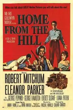 Home from the Hill is a 1960 American melodrama film starring Robert Mitchum, Eleanor Parker, George Peppard, George Hamilton, Everett Sloane and Luana Patten. Directed in CinemaScope by Vincente Minnelli and filmed in Metrocolor, it was produced by Edward Grainger, and distributed by MGM. The screenplay was adapted from the 1958 novel Home from the Hill by William Humphrey. The film was entered into the 1960 Cannes Film Festival.[3] The title is from the last line of Robert Louis Stevenson's short poem "Requiem".