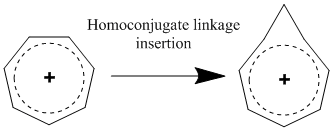 The most important factor in influencing homoaromatic character is the addition of a single homoconjugate linkage into the parent aromatic compound. The location of the homoconjugate bond is not important as all homoaromatic species can be derived from aromatic compounds that possess symmetry and equal bond order between all carbons. The insertion of a homoconjugate linkage perturbs the π-electron density an amount δβ, which depending on the ring size, must be greater than 0 and less than 1, where 0 represents no perturbation and 1 represents total loss of aromaticity (destabilization equivalent to the open chain form).[12] It is believed that with increasing ring size, the resonance stabilization of homoaromaticity is offset by the strain in forming the homoconjugate bridge. In fact, the maximum ring size for homoaromaticity is fairly low as a 16-membered annulene ring favours the formation of the aromatic dication over the strained bridged homocation.[13]