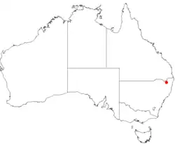 Endemic to Bolivia Hill Nature Reserve, 40km southerly direction from Tenterfield New South Wales. It grows on shallow sandy soils in heath and shrubby woodland on or adjacent to granite outcrops.[6]