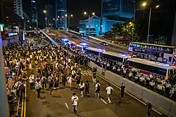 Hundreds of protesters camped in front of the government headquarters well into the night, with more joining them in response to calls from Demosistō and pro-independence activists. Police formed a human chain to prevent protesters from entering Harcourt Road, the main road next to government headquarters, while Special Tactical Squad (STS) stood by for potential conflicts.[73] Although the CHRF officially had called an end to the march at 10 pm, around 100 protesters remained at the Civic Square.[74]