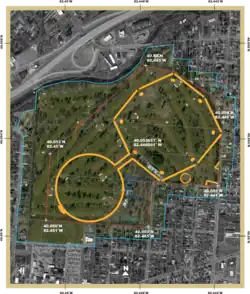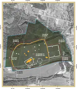 1689-003 Hopeton Earthworks Chillicothe, Ohio 900 ft (270 m) x 950 ft (290 m) rectangle connected to 1,050 ft (320 m) diameter circle with a long ceremonial walkway to the Scioto River and Mound City on the opposite bank. Potentially a unique ceremonial area as there are comparatively few burials or mortuary sites within the enclosure.[7] Owned and managed by the National Park Service as a part of Hopewell Culture National Historical Park. 40°3′13.17″N 82°26′45.82″W / 40.0536583°N 82.4460611°W / 40.0536583; -82.4460611