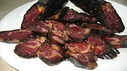 Mongolian horses are valued for their milk, meat and hair. William of Rubruck described the historical milking process as follows: "They stretch a long rope on the ground fixed to two stakes stuck in the ground, and to this rope they tie toward the third hour the colts of the mares they want to milk. Then the mothers stand near their foal, and allow themselves to be quietly milked; and if one is too wild, then a man takes the colt and brings it to her, allowing it to suck a little; then he takes it away and the milker takes its place."[34] Much the same procedure is still used today. In the summer, mares are milked six times a day, once every two hours. A mare produces an average of 0.11 lbs of milk each time, with a yearly production of 662 lbs total.[21] The milk is used to make the ubiquitous fermented drinks of Mongolia, airag and kumis. One particular variety of "black" kumis, caracosmos, was made entirely from the milk of black mares; this was reserved for the aristocracy.[34] William of Rubruck reported that Batu Khan had the milk of three thousand mares collected and sent to his court on a daily basis.[34] In large herds, the gentlest animals are the preferred milk horses. Milk is also boiled and dried into hard white chunks that can be stored and eaten on journeys. During the communist era, Mongolian factories and mines continued to maintain herds of horses specifically for the purposes of providing airag for their workers, which was considered necessary for health and productivity.[48]