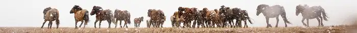 One of the three traditional Mongolian oral epics is the Epic of Jangar, in which horses play roles almost as important as those of the heroes. The most famous horse from the epic is Aranjagaan, Jangar's mount. Aranjagaan was sired by a seven-year-old Heavenly Horse who came down to mate with a mortal mare by a lake. (There is intertextual conflict about this later in the epic, where Aranjagaan's father is described as an ordinary horse who was ridden by Jangar's father.) Aranjagaan's capabilities are described in epic style: "He was red all over and had a body the size of a hill. He had a huge tail and ears. He had hooves the size of a sheep pen and a butt as hard as cast iron. As soon as he was born, he hissed and frightened away wolves, which had stalked near the stall. At the age of one, he joined a war. At two, he fought wars north and south. He was in his prime at the age of seven. Aranjagaan hissed excitedly, making tree leaves, grasses and stones thunder and even frightening boars dozens of baraa away. His power seemed to radiate from within him. One leap forward would bring his rider hundreds of meters away. His power would hold anyone in great awe. His red brilliance was fiery and dazzled everyone who saw him. ... Even Aranjagaan's roaring shook enemies and weakened their knees."[47] Nor are these epic descriptions limited to Aranjagaan. Even the nameless horses like Altan Gheej's crimson mount have poetically glorified capabilities. The crimson horse is described as having a tail 80 feet long and ears like pestles. It can run at a full gallop for two months straight and swim across a sea for 25 days. Moligen Tabuga's scarlet horse is described as being as large as forty-nine seas. Sanale's red horse has ears like iron bars. These sizes and abilities are typical for all epic steeds in the Jangar. In particular, the size of the tail, ears, and hooves are praised, though occasionally one will find the horse's legs described as tree trunks, etc.[47]