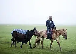 Of the five kinds of herd animals typically recognized in Mongolia (horses, camels, oxen/yaks, sheep and goats), horses are seen to have the highest prestige.[1] A nomad with many horses is considered wealthy. Mongol people individually have favorite horses. Each family member has his or her own horse, and some family members favor their preferred horses by letting them out of hard jobs.