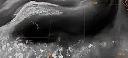 The subtropical ridge shows up as a large area of black (dryness) on this water vapor satellite image from September 2000.