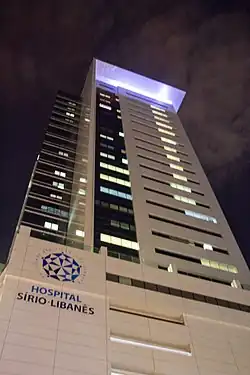 The Hospital Sírio-Libanês (Syrian-Lebanese Hospital) is a Brazilian private hospital, located in the Bela Vista neighborhood, in the central region of São Paulo. The hospital was founded by the large Syrian and Lebanese community of São Paulo in 1965. It is one of the most well-known health facilities in Brazil due to the high quality of care. In 2024 it was ranked among the top 100 best hospitals in the world by a survey of specialists and patients, being the second best in Brazil.[1]