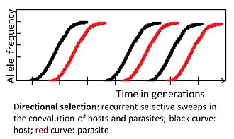 If an allele provides a fitness benefit, its frequency increases within a population – selection is directional or positive. A selective sweep is a form of directional selection where the increase in frequency eventually leads to the fixation of the advantageous allele and other alleles near it. The process is considered to be slower than negative frequency-dependent selection. It may produce an "arms race", consisting of the repeated origin and fixation of new virulence traits in the parasite and new defence traits in the host.[1]