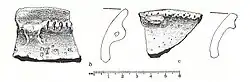 - LaSalle filleted – represented by 15 rim, 3 neck and 358 body sherds; shell-tempered, globular vessels with flared rims, round to flat lips, and a notched fillet on the neck portion. Vessels of this type have been recovered from the Zimmerman site[2] and the Rock Island II site in Green Bay, northern Lake Michigan.[14] Like the Danner Series, this pottery type is also related to the Madisonville Focus. Time period: Protohistoric to Historic. Prehistoric Cultural Affiliation: Fort Ancient. Historic Cultural Affiliation: Unknown, possibly Shawnee.
