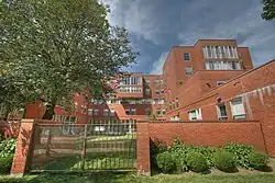 Senior House[89] is the oldest dormitory at MIT and was the first self-governing college dormitory in the United States.[90] Since its construction in 1916, it has served as the institute's first dormitory and on-campus fraternity, a mixed undergraduate and graduate dormitory, an all-graduate facility, a seniors' dormitory, and military housing during World War II. The L-shaped building is directly adjacent to the residence of the President of MIT. A tower at the center of the north side features neo-classical columns that reflect the architecture of the original MIT Cambridge campus.