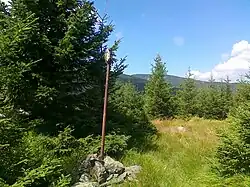 No tourist trail leads to the summit. Hradečná has a single peak.[2] A main path runs almost in a straight line from Hvězda Pass to the pass towards the summit of Vysoká hole. The summit area features a small meadow amidst dense spruce forest, covered with alpine grass.[8][10] Due to the forestation, it offers a limited viewpoint. There are remnants of a former observation gazebo on the summit, consisting of beams and a roof.[2][3] A triangulation station, marked on maps as number 30, is located on the summit at an altitude of 1,056.56 m above sea level, with geographical coordinates 50°04′07.17″N 17°17′25.85″E / 50.0686583°N 17.2905139°E. Near the station is a steel post warning against its destruction, marked with a plaque stating Státní triangulace Poškození se trestá,[b] located about 4 m southeast of the summit. The Czech Office for Surveying, Mapping, and Cadastre (ČÚZK) in Prague indicates the highest point of the mountain – the summit – as 1,056.8 m above sea level with geographical coordinates 50°04′07.2″N 17°17′25.7″E / 50.068667°N 17.290472°E.[8]