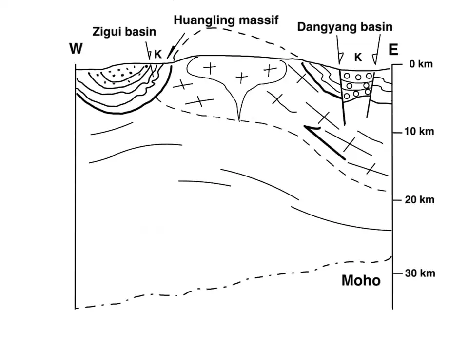 - During Lower Late Jurassic to Upper Cretaceous, the intracontinental belt, namely the Qinling-Tongbai-Dabie belt and Xuefengshan-Jiuling belt to the north and south of Huangling massif, respectively, thrust over it.[3] They squeezed Huangling massif to the west. An asymmetric ramp anticline trending north-south with steeper western slope and gentler eastern slope was formed. Evidence of thrust deformation can be found in the northern and southern rim of the Huangling dome.[29]