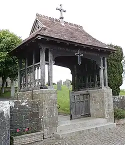 Lychgate, St Hieritha's Church, Chittlehampton, incorporating a small white marble plaque inscribed: "To the glory of God and in memory of John Baring Short, died at Hudscott Decr 10th 1880 aged 44 years"
