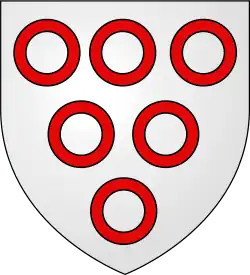 Coat of arms of Hugh de Plessets, Lord of Hooknorton, Argent, six annulets gules (3, 2, 1).