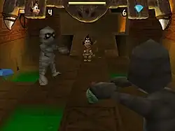 Hugo: Quest for the Sunstones is a 3D platform game similar to Crash Bandicoot, with diamonds replacing the collectible apples from Crash. The player character can attack enemies by either jumping on them or hitting them with a whip Indiana Jones-style.[1] There are also first-person perspective sliding sections.