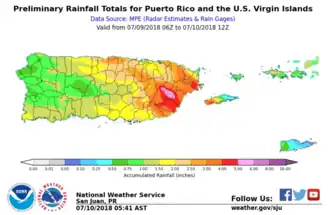 Mass power outages were reported on the U.S. Virgin Island of St. Croix, and officials ordered closures of schools and government offices.[41][1] Due to the effects of previous Hurricanes Irma and Maria, over 60,000 people in Puerto Rico had blue tarps provided by FEMA as temporary roofs. However, tarps were easily blown off due to strong wind gusts from Beryl's remnants.[46] Lieutenant Governor Luis Rivera Marín reported that some rivers began flooding by noon local time on July 9.[47] Rainfall was the heaviest in Eastern Puerto Rico, where over 8 inches of rain fell.[49] The enhanced rainfall also triggered flash flooding that closed several roadways and downed several trees. A landslide was reported in the town of Naranjito, although there were no reports of fatalities or injuries.[50] A tree was blown down onto a road in Guayama.[51] Floodwaters entered a residence in Las Piedras, trapping three people.[52] The Fajardo River overflowed its banks, causing a road to be impassable.[53] Vehicles were trapped on Puerto Rico Highway 909 near Humacao after the road was inundated by floodwaters.[54] By the time the storm passed, approximately 47,000 Puerto Ricans lost power on the island as a result of gusty winds from squalls.[1][55]