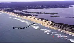 Storm surge left three towns on Hatteras Island isolated from the rest of the state as an 8 ft (2.4 m) deep channel was created on North Carolina Highway 12. Additionally, storm surge cut-off the route between Avon and Buxton and left 4 ft (1.2 m) of sand lying upon portions of Highway 12.[16] In Carteret, Craven, and Dare counties, the storm damaged at least 2,025 homes and businesses to some degree. The storm brought major damage to 75 homes and minor damage to 230 others in Carteret County. Tides along the Neuse River ranged from 8 to 10 ft (2.4 to 3.0 m) above normal, flooding homes near Adams, Clubfoot, and Harlowe creeks,[17] including between 100 and 150 dwellings in Harlowe.[18] The county also suffered agricultural losses, totaling about $3.5 million. A total of 120 dwellings in Craven County experienced substantial damage.[17]
