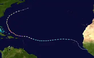 Map plotting the storm's track and intensity, according to the Saffir–Simpson scale