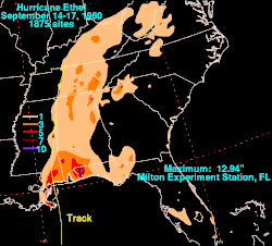 Hurricane Ethel also brought heavy rains and strong winds to much of the Florida Panhandle.[3] A maximum of 12.94 inches (329 mm) of rain fell at an agricultural experiment station near Milton, Florida, the highest total measured at an official station and attributed to this storm.[12] Hurricane Donna struck Tampa, Florida, particularly hard earlier in the month, causing major flooding of Hillsborough River (Florida) at Zephyrhills, Florida on 12 September. People feared severe flooding of the Hillsborough River into Tampa, which did not occur.[13] The highest wind gust in the state was 50 miles per hour (80 km/h), measured in both Pensacola and Apalachicola.[10] A thunderstorm associated with Ethel produced lightning that hit a power station near Tallahassee, causing a citywide blackout for 10 minutes (600 s). According to Florida Highway Patrol, Ethel directly caused damage of $100,000 (1960 USD) in the state.[14] Additionally Ethel spawned four tornadoes[10] in Florida, one of which reached F2 intensity and damaged or destroyed 25 homes near Panama City.[15]