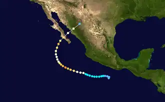 Hurricane Norbert is tied with Hurricane Jimena as the strongest tropical cyclone to strike the west coast of Baja California Sur in recorded history. The fifteenth named storm, seventh hurricane, and second major hurricane of the 2008 hurricane season, Norbert originated as a tropical depression from a tropical wave south of Acapulco on October 3. Strong wind shear initially prevented much development, but the cyclone encountered a more favorable environment as it moved westward. On October 5, the National Hurricane Center (NHC) upgraded the depression to Tropical Storm Norbert, and the system intensified further to attain hurricane intensity by October 6. After undergoing a period of rapid deepening, Norbert reached its peak intensity as a Category 4 on the Saffir–Simpson hurricane wind scale, with maximum sustained winds of 135 mph (217 km/h) and a minimum barometric pressure of 945 mbar (945 hPa; 27.9 inHg). As the cyclone rounded the western periphery of a subtropical ridge over Mexico, it began an eyewall replacement cycle which led to steady weakening. Completing this cycle and briefly reintensifying into a major hurricane, a Category 3 or higher on the Saffir–Simpson hurricane wind scale, Norbert moved ashore Baja California Sur as a Category 2 hurricane late on October 11. After a second landfall at a weaker intensity the following day, the system quickly weakened over land and dissipated that afternoon.