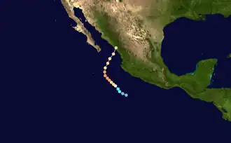 Early on October 8, a tropical depression had developed far from land. Initially, the storm moved west-northwest, but it turned to the northwest six hours after forming. Over sea surface temperatures of 82 °F (28 °C), the storm intensified into Tropical Storm Norma at 0600 UTC .[1] By midday on October 9, the winds had reached 50 mph (85 km/h) and on 1800 UTC October 9, the Eastern Pacific Hurricane Center upgraded the storm into a hurricane [2] and a well-defined eye became visible via satellite imagery.[1]