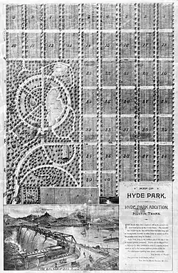 Established in 1891 by the Missouri, Kansas and Texas Land and Town Company, Hyde Park was marketed under the direction of Monroe Martin Shipe as a majority-white, affluent suburb featuring large, majestic residences, separate from the racially integrated neighborhoods of the city.[8] Ads touted Hyde Park as "free from nuisances and an objectionable class of people, proper restrictions being taken to guard against undesirable occupants."[9] Critical to the suburb's success was the establishment of an electric streetcar system. After the City Council awarded Shipe a franchise in 1890, his Austin Rapid Transit Railway Company built its first line on Congress Avenue, west on Sixth Street, and north on Rio Grande Street and Old Georgetown Road (now Guadalupe Street) to Hyde Park.[10]