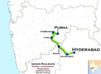 Hyderabad - Purna Passenger is a passenger train belonging to South Central Railway zone that runs between Hyderabad Deccan and Purna Junction. It is currently being operated with 57547/57548 train numbers on a daily basis.[1][2][3]