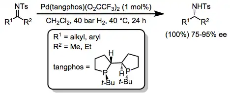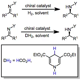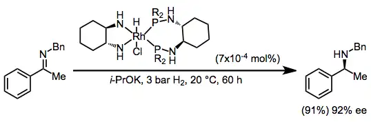 In chemistry, the hydrogenation of carbon–nitrogen double bonds is the addition of the elements of dihydrogen (H2) across a carbon–nitrogen double bond, forming amines or amine derivatives.[1] Although a variety of general methods have been developed for the enantioselective hydrogenation of ketones,[2] methods for the hydrogenation of carbon–nitrogen double bonds are less general. Hydrogenation of imines is complicated by both syn/anti isomerization and tautomerization to enamines, which may be hydrogenated with low enantioselectivity in the presence of a chiral catalyst.[3] Additionally, the substituent attached to nitrogen affects both the reactivity and spatial properties of the imine, complicating the development of a general catalyst system for imine hydrogenation. Despite these challenges, methods have been developed that address particular substrate classes, such as N-aryl, N-alkyl, and endocyclic imines.