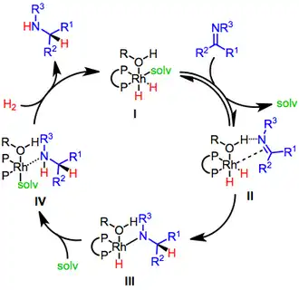 Relevant to the inner sphere mechanism are the two modes by which imines can coordinate, as a π or as a σ-donor ligand. The pi-imines are also susceptible to conversion to iminium ligands upon N-protonation. The binding mode for the imine is unclear, both η1 (σ-type) and η2 (π-type). The final step in the mechanism is release of the amine.[5] In some iridium-catalyzed hydrogenations, the mechanism is believed to proceed via a monohydride species. The oxidation state of iridium is always +3. Examples:[6][7][8][9][10] [11]