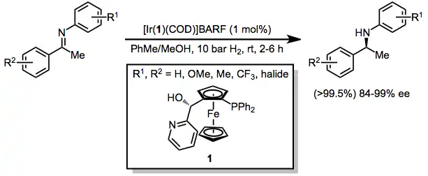 Imine hydrogenation provides a practical route to chiral amines.[16] Metolachlor is the active ingredient in the widely used herbicide Dual Magnum. A key step in its industrial production involves the enantioselective reduction of an N-aryl imine. This reduction is achieved with extremely high turnover number (albeit moderate enantioselectivity) through the use of a specialized catalyst system consisting of [Ir(COD)Cl]2, modified Josiphos ligand 3, and acid and iodide additives.[17]