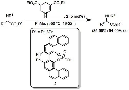 α-Carboxy imines are attractive precursors for α-amino acids. Organocatalytic reduction of these substrates is possible using a Hantzsch ester and a chiral phosphoric acid catalyst.[15]