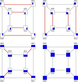 -dimensional hypercube is a network topology for parallel computers with processing elements. The topology allows for an efficient implementation of some basic communication primitives such as Broadcast, All-Reduce, and Prefix sum.[1] The processing elements are numbered through . Each processing element is adjacent to processing elements whose numbers differ in one and only one bit. The algorithms described in this page utilize this structure efficiently.