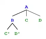 The node labelled A immediately dominates the nodes B, C, and D, and the node labelled B immediately dominates C' and D'. A also dominates C' and D', but not immediately