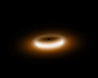The disc around IRAS 08544−4431 at 2μm and 10μm. Although the image resembles a doughnut lit from the front, the brightest arc is the inner wall of the far side of the disc, lit by the stars at the centre.