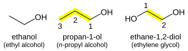 Alcohols (R−OH) take the suffix "-ol" with a numerical suffix indicating the bonding position: CH3CH2CH2OH is propan-1-ol. The suffixes -diol, -triol, -tetrol, etc., are used for multiple −OH groups: Ethylene glycol CH2OHCH2OH is ethane-1,2-diol.