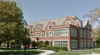 The IU Rotary Building, originally known as the Indiana Rotary Convalescent Home, is located at 702 Rotary Circle, Indianapolis, in the US state of Indiana, and was constructed in 1932. The Rotary Building is a two-story Tudor Revival style building with 28,300 square feet (2,630 m2).[1] The building has a moderate-pitched side-gabled roof with square-like wings on both sides of the main body. The walls are built with red brick in Flemish bonding style, and there is limestone detailing surrounding the windows and above the main entrance. The limestone above the main entrance has decorative limestone with the words “Rotary” and “Convalescent” etched into it. The first floor of the façade has nine flattened Tudor arches. Above the main entrance, there is a roof terrace that overlooks the adjacent Ball Gardens and Convalescent Park and Ball Residence Hall to the south. The roof is covered with light grey asphalt shingles. The Rotary Building is located on the west side of the Indiana University Indianapolis campus.