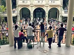 With an estimated budget of PHP 30 million, the film began principal photography in January 2012, but was sparsely scheduled throughout the year with a total of 27 shooting days.[2] The film continues to shoot at the height of summer season to be able to film the outdoor choreography, under choreographer Nancy Crow.[34][35] According to the producers, the film features a total of 18 songs from the APO, with the cast singing the songs. The scene in "Blue Jeans" of Concepcion and Coleta along with 350 background dancers, was shot inside the De La Salle University in Dasmariñas, Cavite. The farm of the Fuentebella's was shot in Nueva Ecija, while the numerous gates of the mansion was taken in Bulacan.[17] The Polotan's residence was shot in Liliw, Laguna. Some of the scenes were shot in China town in Binondo, Manila especially the scene where Coleta and Concepcion, both drunk, running for home while the rain is pouring down.[17] The "Ang Syota kong Pa-Class" number of Concepcion and Coleta was shot in a basketball court in Baranggay Roxas, Caloocan.