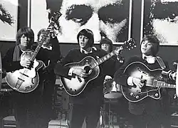 This criticism had a large impact on the group, and they began writing more songs in order to evolve their craft.[9] The group's bassist Göran Lagerberg and rhythm guitarist Danne Larsson sat down and wrote "I Should Be Glad" together.[10] Wrigholm describes the song as being in the Merseybeat style, heavily influenced by the English groups the Searchers and Gerry and the Pacemakers,[1] who were both around their peak popularity in the UK and Sweden towards the end of 1964.[11][12][4][5] On 30 December 1964, the group traveled to Stockholm to record the single after their record label Platina had booked studio time.[10] As Platina had no studio of their own, Metronome Studios was booked, with former Violents guitarist Rune Wallebom as the producer.[10] Four songs were cut during this session: "I Should Be Glad", "I Cry", and re-recordings of both "Sleep Little Girl" and "Tell Me You're Mine", the A- and B-sides of their debut single.[10]