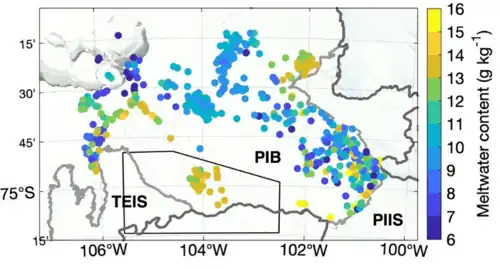 Distribution of meltwater hotspots caused by ice losses in Pine Island Bay, the location of both Thwaites (TEIS refers to Thwaites Eastern Ice Shelf) and Pine Island Glaciers.[21]