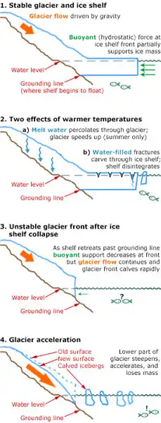 In the 1970s, Johannes Weertman proposed that because seawater is denser than ice, then any ice sheets grounded below sea level inherently become less stable as they melt due to Archimedes' principle.[17] Effectively, these marine ice sheets must have enough mass to exceed the mass of the seawater displaced by the ice, which requires excess thickness. As the ice sheet melts and becomes thinner, the weight of the overlying ice decreases. At a certain point, sea water could force itself into the gaps which form at the base of the ice sheet, and marine ice sheet instability (MISI) would occur.[17][18]