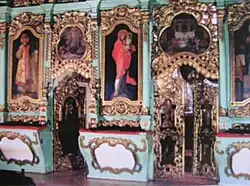 Almost 60 years later, in 1937, the iconostasis was renovated again although but the re-painting work was considered to be of really low artistic quality. This time the icons were not removed from the frame, and only a thick layer of varnish was applied to them. This layer made the icons lose their original colors and become even darker. The wooden structure of the iconostasis was painted with light green oil paint.[11][12]