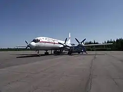 The prototype SSSR-L5811 was rolled out in June 1957 and after ground-testing it began taxi test and high-speed runs on 1 July 1957.[2] On 4 July 1957 the prototype first flew from Khodynka.[2] On 10 July 1957 the aircraft was flown to Moscow-Vnukovo Airport to be presented to a Soviet government commission; also present was the prototype Antonov An-10 and the Tupolev Tu-114.[2] The Il-18 type was formally named Moskva and this was painted on the fuselage, although the name was not used when the aircraft entered production.[2]
