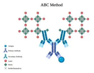 This technique is considered to be more sensitive than primary immunofluorescence, because multiple secondary antibodies can bind to the same primary antibody. The increased number of fluorophore molecules per antigen increases the amount of emitted light, and thus amplifies the signal.[1] There are different methods for attaining a higher fluorophore-antigen ratio such as the Avidin-Biotin Complex (ABC method) and Labeled Streptavidin-Biotin (LSAB method).[15][16]