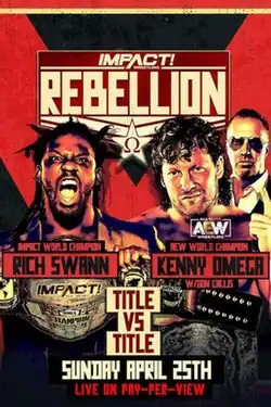 During All Elite Wrestling's (AEW) special episode of Dynamite titled Winter Is Coming, Impact EVP Don Callis helped Kenny Omega win the AEW World Championship from Jon Moxley, before the pair fled Daily's Place to Skyway Studios for an Impact! taping.[2][3] The following Tuesday on Impact, Callis and Omega would arrive in a tour bus, discussing the 27-year plan they had to take over the wrestling business. Callis would also intrigue Omega with the prospect of challenging for Impact's titles, with Omega dubbing himself "The Collector".[4] After several appearances on Impact, Omega would make his Impact in-ring debut at Hard To Kill; he teamed with Impact World Tag Team Champions The Good Brothers (Doc Gallows and Karl Anderson) to defeat Chris Sabin, Impact World Champion Rich Swann, and self-proclaimed TNA World Heavyweight Champion Moose (subbing for Alex Shelley).[5][6][7] On the March 9 episode of Impact, Impact EVP Scott D'Amore announced that Omega would wrestle in the main event of Rebellion in a title vs. title match, and he would face the winner of a championship unification match between Rich Swann and Moose, which would take place at Sacrifice.[8][9] Swann won the match, making the match Swann vs. Omega for the Impact and AEW World Championships.[10] On April 15, it was announced that Mauro Ranallo would be the guest commentator for the main event.[11] It was also revealed that in addition to an Impact referee, an AEW referee would also be present to ensure there would be a definitive winner.[12]