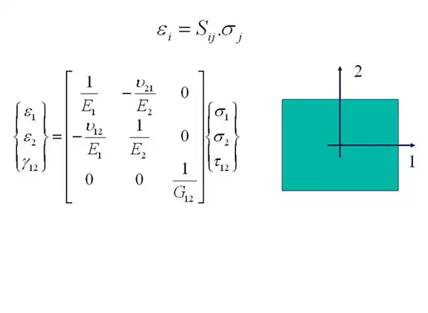 In this expression, ε1 and ε2 are normal strains in the 1- and 2-direction and Υ12 is the shear strain. σ1 and σ2 are the normal stresses and τ12 is the shear stress. The orientation of the axes 1 and 2 in the above figure is arbitrary. This means that the values for E, G and v are the same in any material direction.